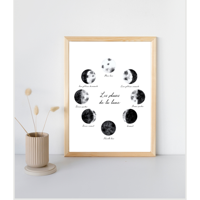 Découvrez cette affiche A4 représentant les phases de la Lune, (reproduction d'une illustration réalisée à l'aquarelle). Cette œuvre d'art unique capture la beauté mystique de la Lune dans ses différentes phases, ajoutant une touche céleste et élégante à votre décoration intérieure.